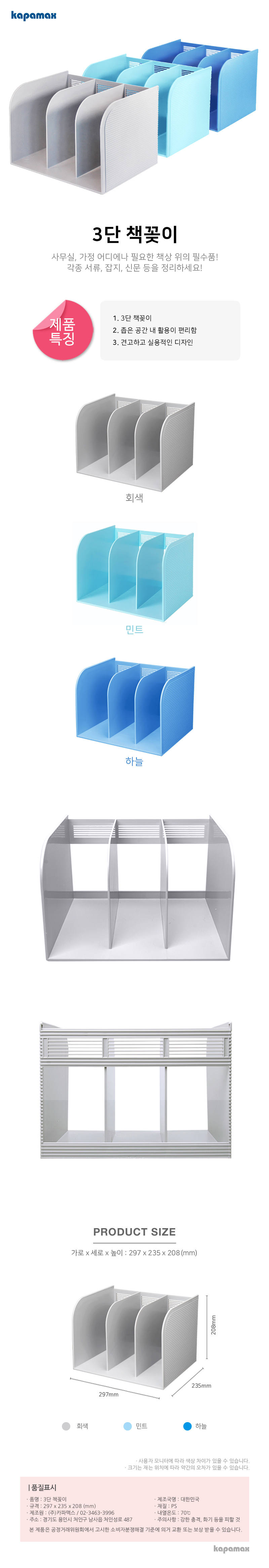 [카파맥스] 31100 3단책꽂이(민트/W297*D235*H208)