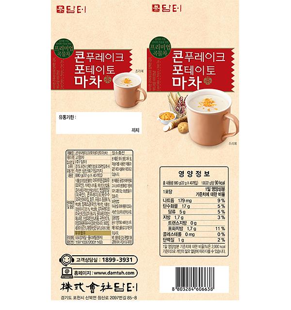 식물성크림분[물엿, 야자부분경화유(외국산), 카제인나트륨, 제이인산칼륨, 글리세린지방산에스테르], 찐쌀분말(외국산), 콘푸레이크{옥수수[외국산(브라질,호주,프랑스 등)]66%, 백설탕, 정제소금(국산), 맥아엿, 식물성경화유지]}20%, 백설탕, 감자푸레이크(미국산)(건조감자99.4%, 글리세린지방산에스테르, 산성피로인산나트륨, 구연산)10%, 마알파옥분{ |