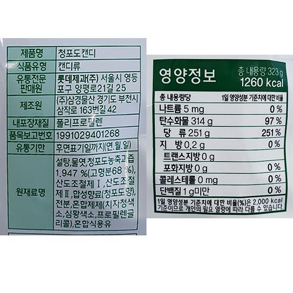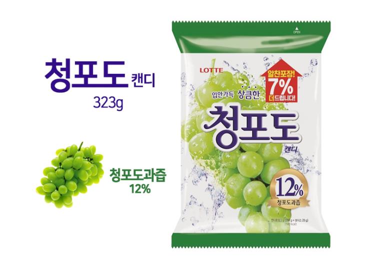 설탕,물엿,청포도농축과즙1.947%(고형분68%),산도조절제I,산도조절제II,합성향료(청포도향),전분,혼합제제(치자청색소,심황색소,프로필렌글리콜),혼합식용유 |