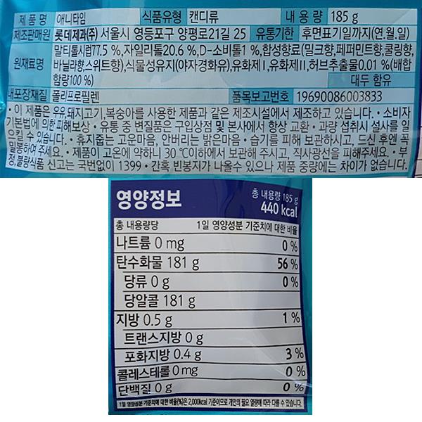 1회 제공량당 함량 : 열량25kcal[1회제공량3개(11g)], 나트륨0mg(0%), 탄수화물11g(3%), 당류0g, 당알콜11g, 지방0g(0%), 트랜스지방0g, 포화지방0g(0%), 콜레스테롤0mg(0%), 단백질0g(0%) |