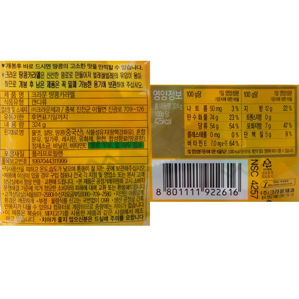 물엿,갈색설탕,땅콩(중국산),식물성유지(팜핵경화유,레시틴(대두)),혼합분유(우유),소맥분(밀),레시틴,합성착향료(땅콩향,바닐린),유화제,한천,정제소금,비타민E,땅콩15% |