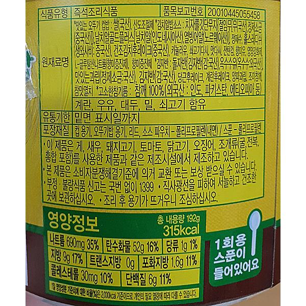 열량315kcal[총 내용량(192g)당], 탄수화물52g(16%), 당류1g(1%), 단백질6g(11%), 지방9g(17%), 포화지방1.6g(-%), 트랜스지방0g, 콜레스테롤30mg(10%), 나트륨690mg(35%) |