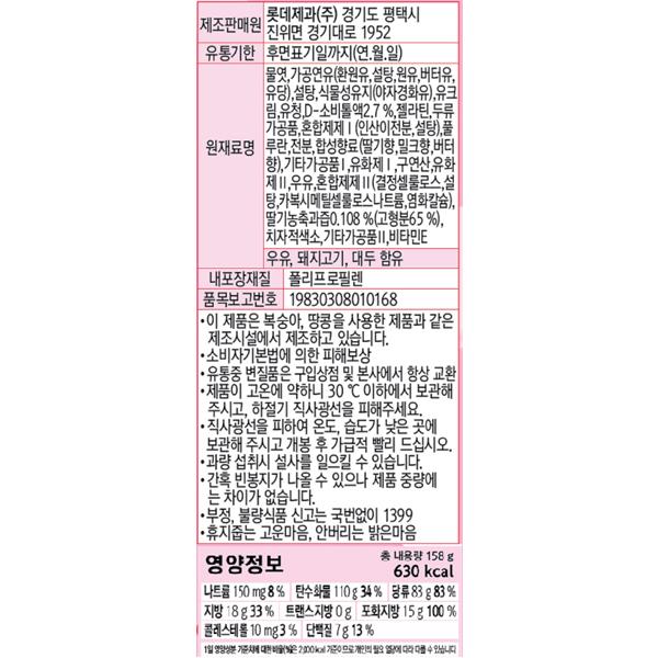 물엿,가공연유(환원유,설탕,원유,버터유,유당)설탕, 식물성유지(야자경화유),유크림,유청,D-소비톨액2.7%,젤라틴,두류가공품,혼합제제Ⅰ(인산이전분,설탕),풀루란,전분,합성향료(딸기향,밀크향,버터향),기타가공품Ⅰ,유화제Ⅰ,구연산,유화제Ⅱ(결정셀룰로스,설탕,등)등 |