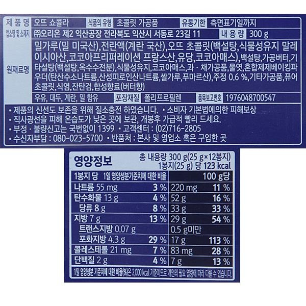 열량123kcal[1봉(25g)당], 나트륨55mg(3%), 탄수화물13g(4%), 당류8g(8%), 지방7g(13%), 트랜스지방0.07g, 포화지방4.3g(29%), 콜레스테롤21mg(7%), 단백질2g(4%) |