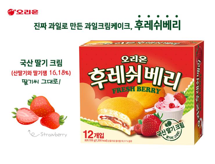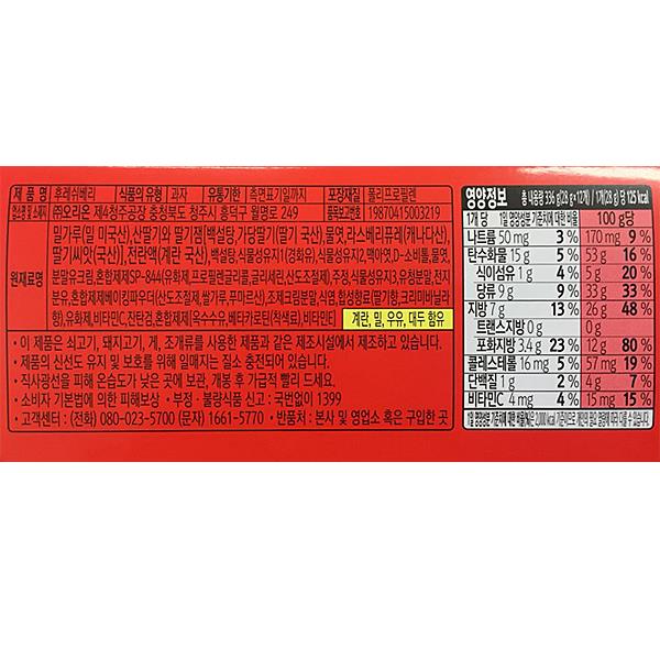 밀가루(밀:미국산),전란액(계란:국산),산딸기와딸기잼(백설탕,가당딸기:국산,물엿,라스베리퓨레:캐나다산,딸기씨앗:국산),백설탕,식물성유지1,경화유,식물성유지2,맥아엿,D-소르비톨,물엿,분말유크림,혼합제제SP-844(유화제,프로필렌글리콜,글리세린,산도조절제), 산딸기와딸기잼16.11%,비타민C25mg/100g, 등 |