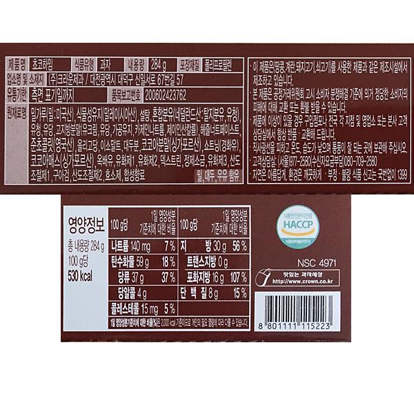 1회 제공량당 함량 : 열량175kcal[1회제공량2봉지(32g)당], 탄수화물18g(5%), 당류11g, 단백질3g(5%), 지방10g(20%), 포화지방5g(33%), 트랜스지방0g, 콜레스테롤0mg(0%), 나트륨40mg(2%) |