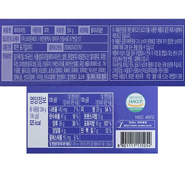1회 제공량당 함량 : 열량170kcal[1회제공량2봉지(32g)당], 탄수화물19g(6%), 당알콜1g, 당류10g, 단백질2g(4%), 지방10g(20%), 포화지방5g(33%), 트랜스지방0g, 콜레스테롤5mg미만(1%), 나트륨55mg(3%) |