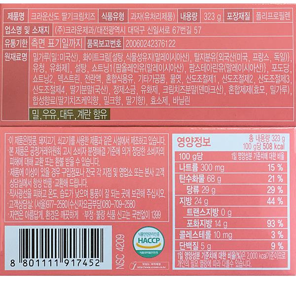 밀가루(밀:미국산),화이트크림[백설탕,식물성유지(말레이시아산),탈지분유{외국산(미국,프랑스,독일)},유청,유화제],설탕,쇼트닝1{팜올레인유(말레이시아산),팜스테아린유(말레이시아산)},포도당,쇼트닝2,덱스트린,전란액, 등 |