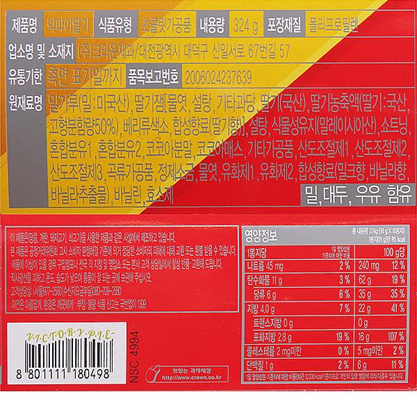 밀가루(밀:미국산),딸기잼[물엿,설탕,기타과당,딸기(국산),딸기농축액(딸기:국산,고형분함량50%),베리류색소,합성향료(딸기향)],설탕,식물성유지(말레이시아산),쇼트닝,혼합분유1,혼합분유2,코코아분말,코코아매스, 등 |