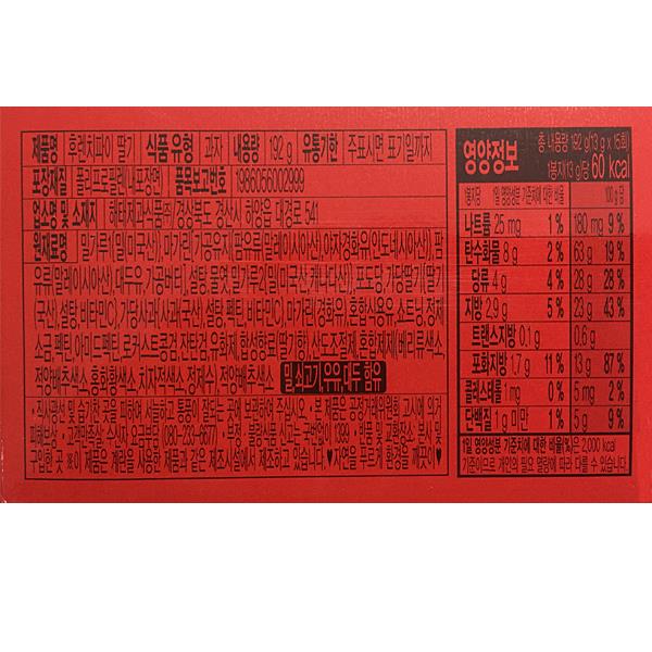 열량60kcal[1봉지(13g)당], 탄수화물8g(2%), 당류4g(4%), 단백질1g미만(1%), 지방2.9g(5%), 포화지방1.7g(11%), 트랜스지방0.1g, 콜레스테롤1mg(0%), 나트륨25mg(1%) |