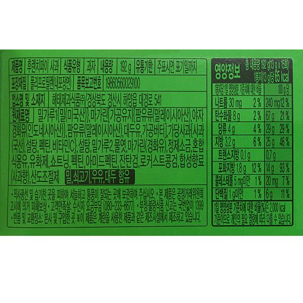 열량65kcal[1봉지(13g)당], 탄수화물8g(2%), 당류4g(4%), 단백질1g미만(1%), 지방3.2g(6%), 포화지방1.8g(12%), 트랜스지방0.1g, 콜레스테롤5mg미만(1%), 나트륨30mg(2%) |