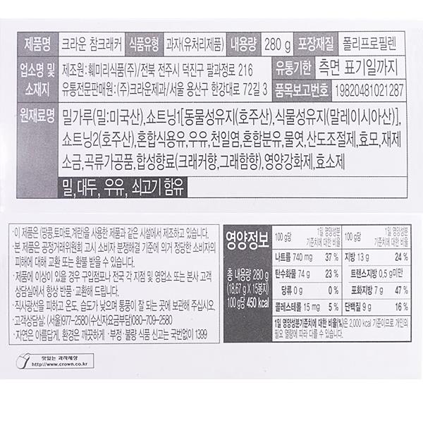 밀가루(밀:미국산),쇼트닝1[동물성유지(호주산),식물성유지(말레이시아산)],쇼트닝2(호주산),혼합식용유,우유,천일염,혼합분유,물엿,산도조절제,효모,재제소금,곡류가공품,합성향료(크래커향,그래함향),영양강화제,효소제 |