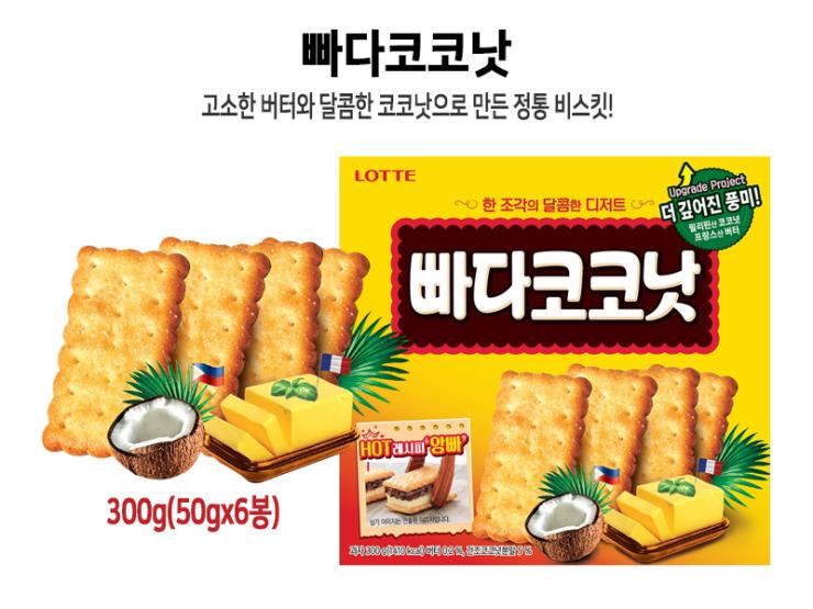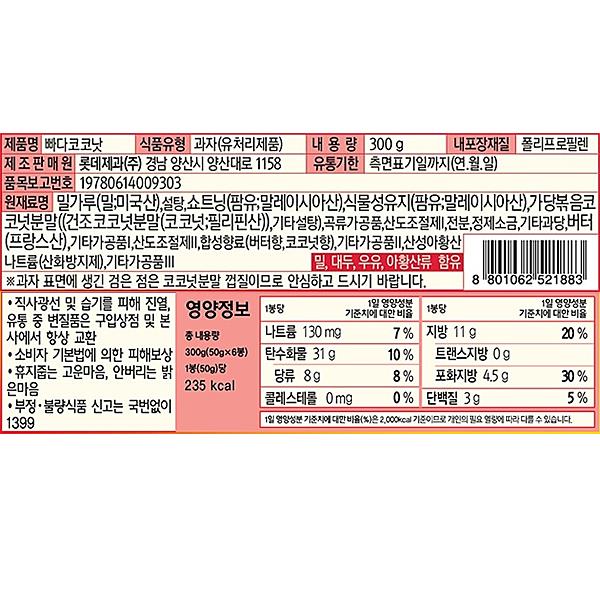 밀가루(밀:미국산),설탕,쇼트닝(팜유:말레이시아산),식물성유지(팜유:말레이시아산),가당볶음코코넛분말((건조코코넛분말(코코넛:필리핀산)),기타설탕),곡류가공품,산도조절제I,전분,정제소금,기타과당,버터(프랑스산), 등 |