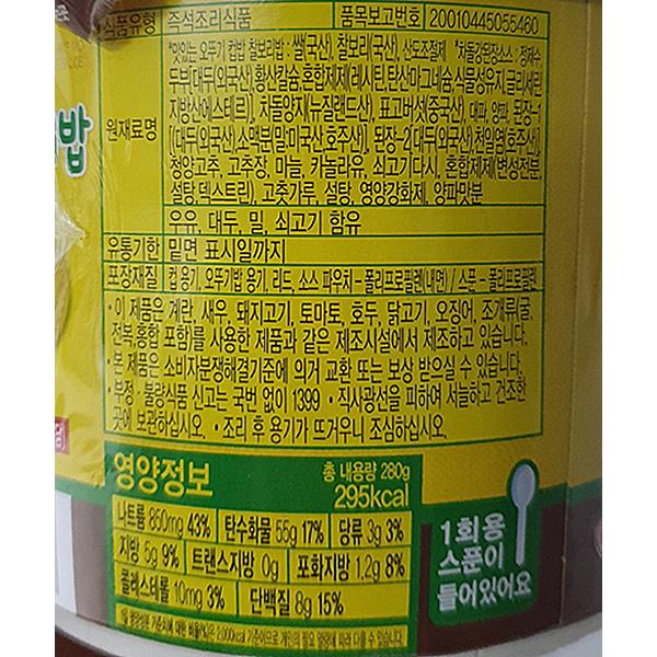 열량295kcal[총 내용량(280g)당], 탄수화물55g(17%), 당류3g(3%), 단백질8g(15%), 지방5g(9%), 포화지방1.2g(-%), 트랜스지방0g, 콜레스테롤10mg(3%), 나트륨850mg(43%) |