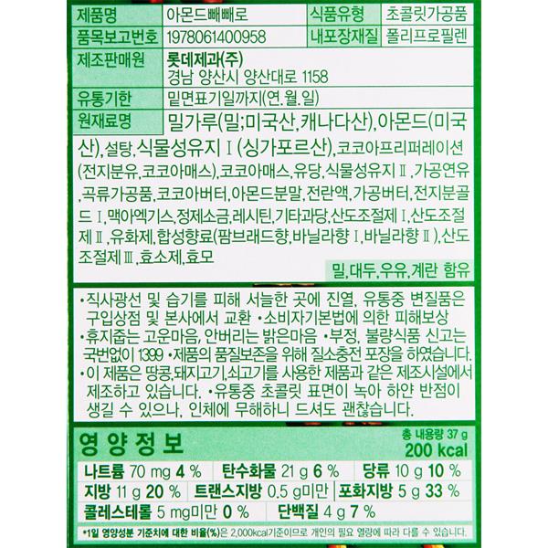 밀가루(밀:미국산,캐나다산),아몬드(미국산),설탕,식물성유지Ⅰ(싱가포르산),코코아프리퍼레이션(전지분유,코코아매스),코코아매스,유당,식물성유지Ⅱ,가공연유,곡류가공품,코코아버터,아몬드분말,전란액,가공버터,전지분골드Ⅰ,맥아엑기스,정제소금,레시틴 등 |