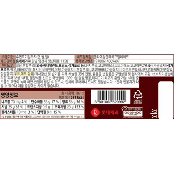 설탕,혼합분유Ⅰ[외국산(네덜란드,프랑스,싱가포르 등):전지분유,코코아매스],코코아매스(코코아빈:가나산),가공유지Ⅰ(싱가포르산:팜유,유,해바라기유,레시틴,비타민E),유당,가공유지Ⅱ,혼합분유Ⅱ,코코아버터,가공유지Ⅲ,아몬드분말,레시틴 등 |