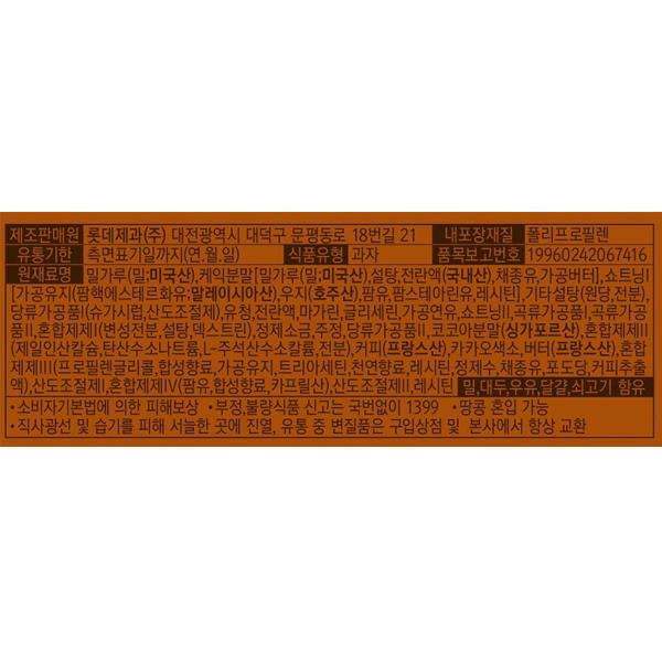 1회 제공량당 함량 : 열량112kcal[1봉(22g)당], 나트륨85mg(4%), 탄수화물13g(4%), 당류7g(7%), 지방6g(11%), 트랜스지방0.5g미만, 포화지방3.1g(21%), 콜레스테롤6mg(2%), 단백질1.5g(3%) |