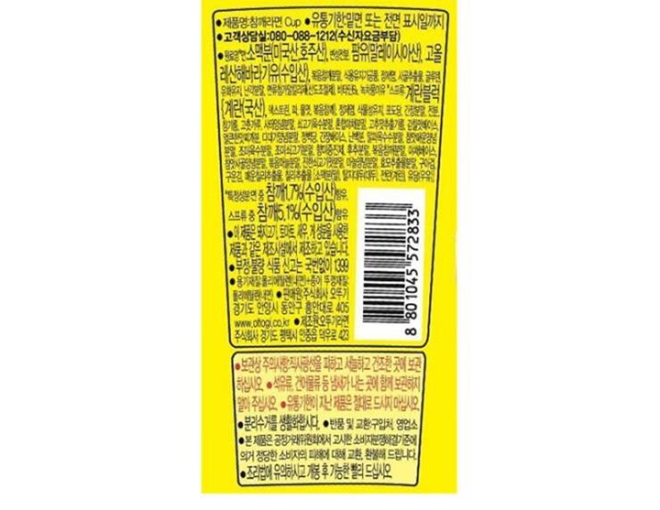 면 : 소맥분(미국산, 호주산),변성전분,팜유(말레이시아산),감자전분,고올레산해바라기유(수입산),볶음참깨분말,식용유지가공품,정제소금,글루텐,사골추출물,유화유지,난각분말,면류첨가알칼리제(산도조절제),비타민B2 스프류 : 계란블럭{계란(국산),덱스트린,파,물엿,볶음참깨} 등 |