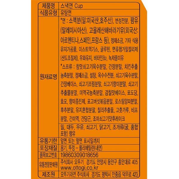 면:소맥분(밀:미국산,호주산),변성전분,팜유(말레이시아산),고울레산해바라기유(외국산:아르헨티나,스페인,프랑스 등),정제소금,기타식용유지가공품,이스트엑기스,글루텐,면류첨가알칼리제(산도조절제),유화유지,비타민B2,녹차풍미유 스프:참맛쇠고기육수분말,간장분말 등 |